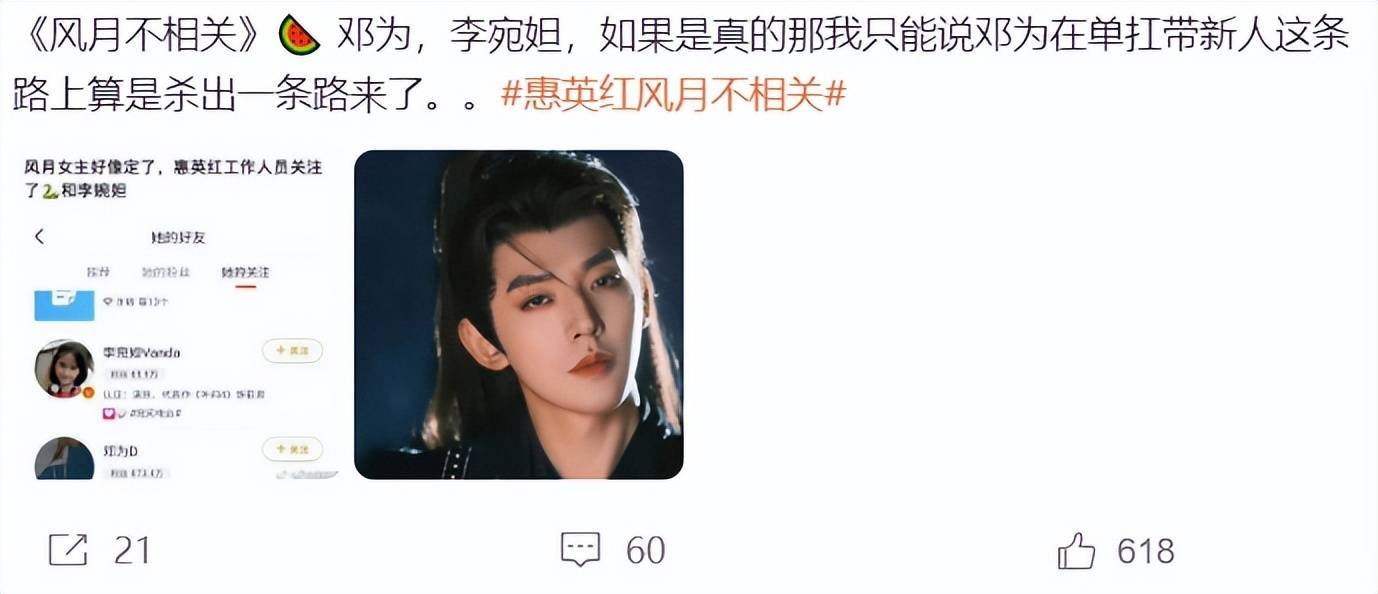 从网上出现的消息上看,惠英红的工作人员,同时关注邓为和李宛妲,正因如此,才传出李宛妲要出演《风月不相关》,各位读者,你们认为邓为和李宛妲有CP感吗?